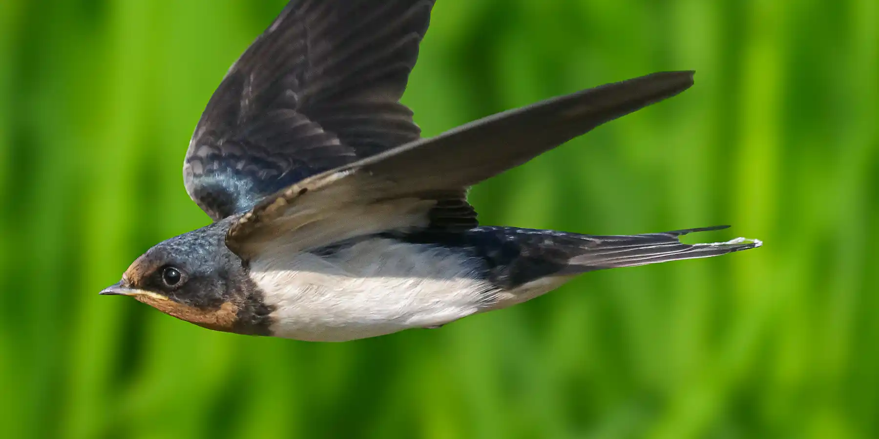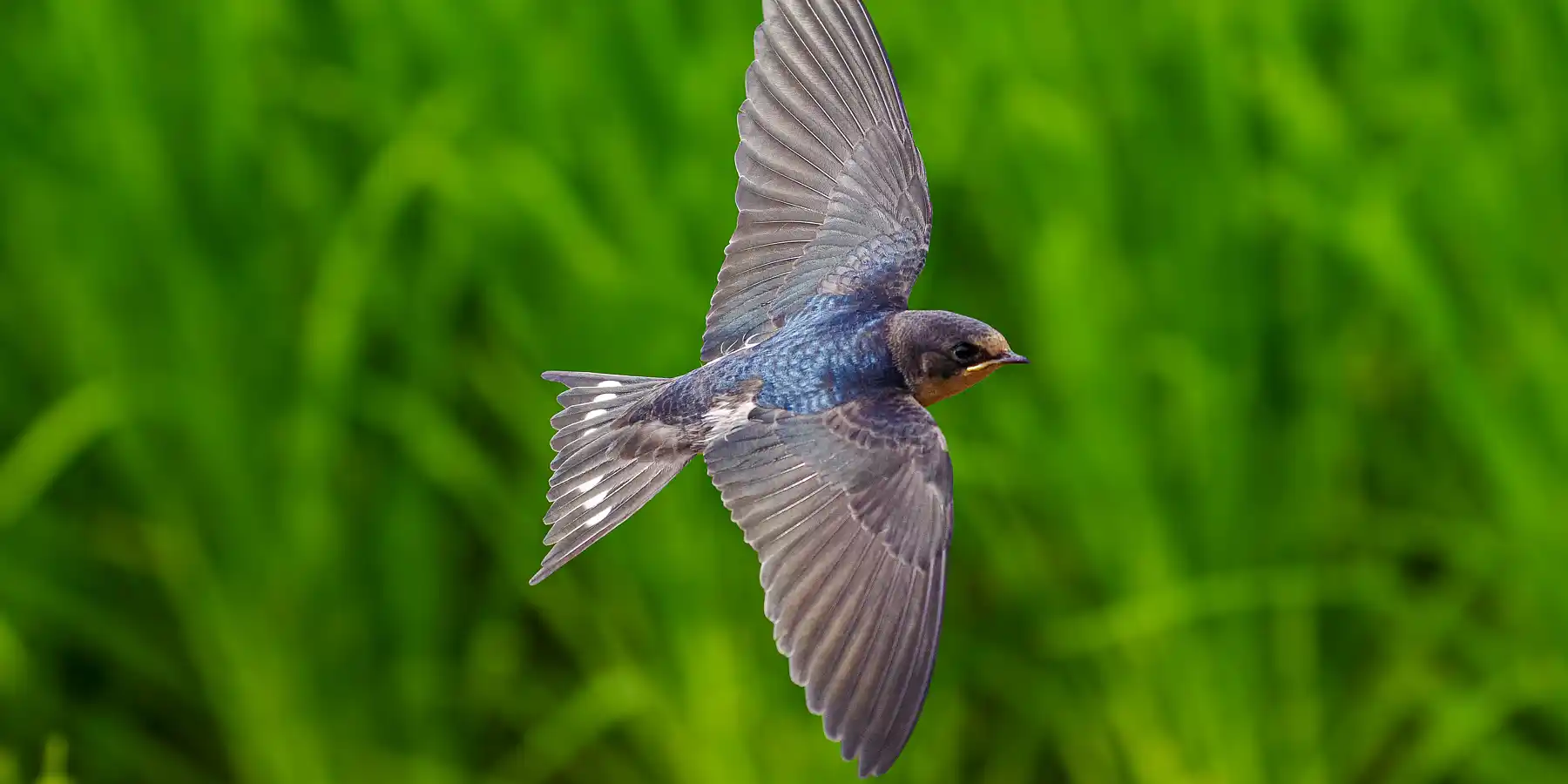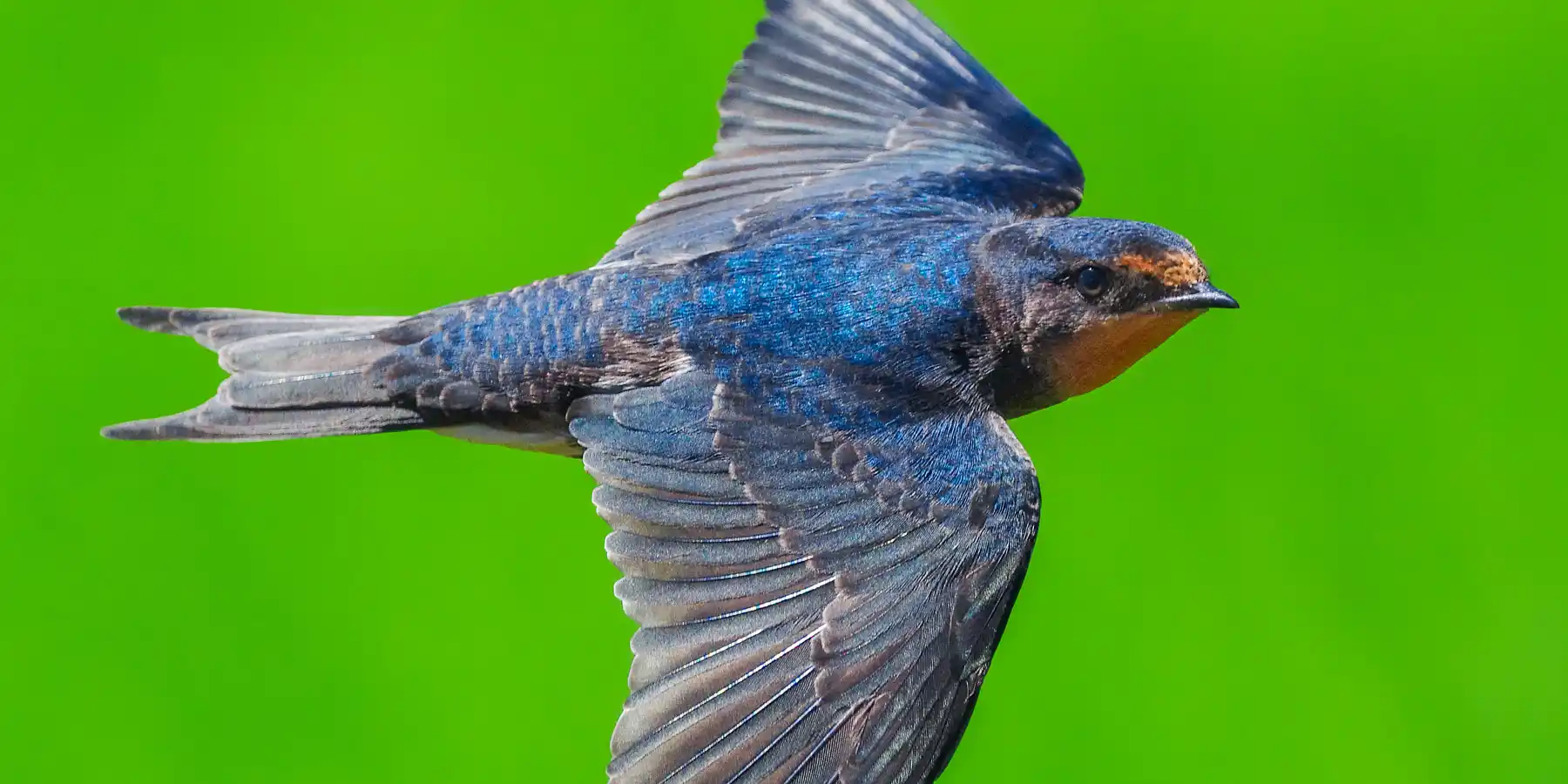 ツバメの背は光沢のある紺色で、喉と額が赤茶。腹は白い。