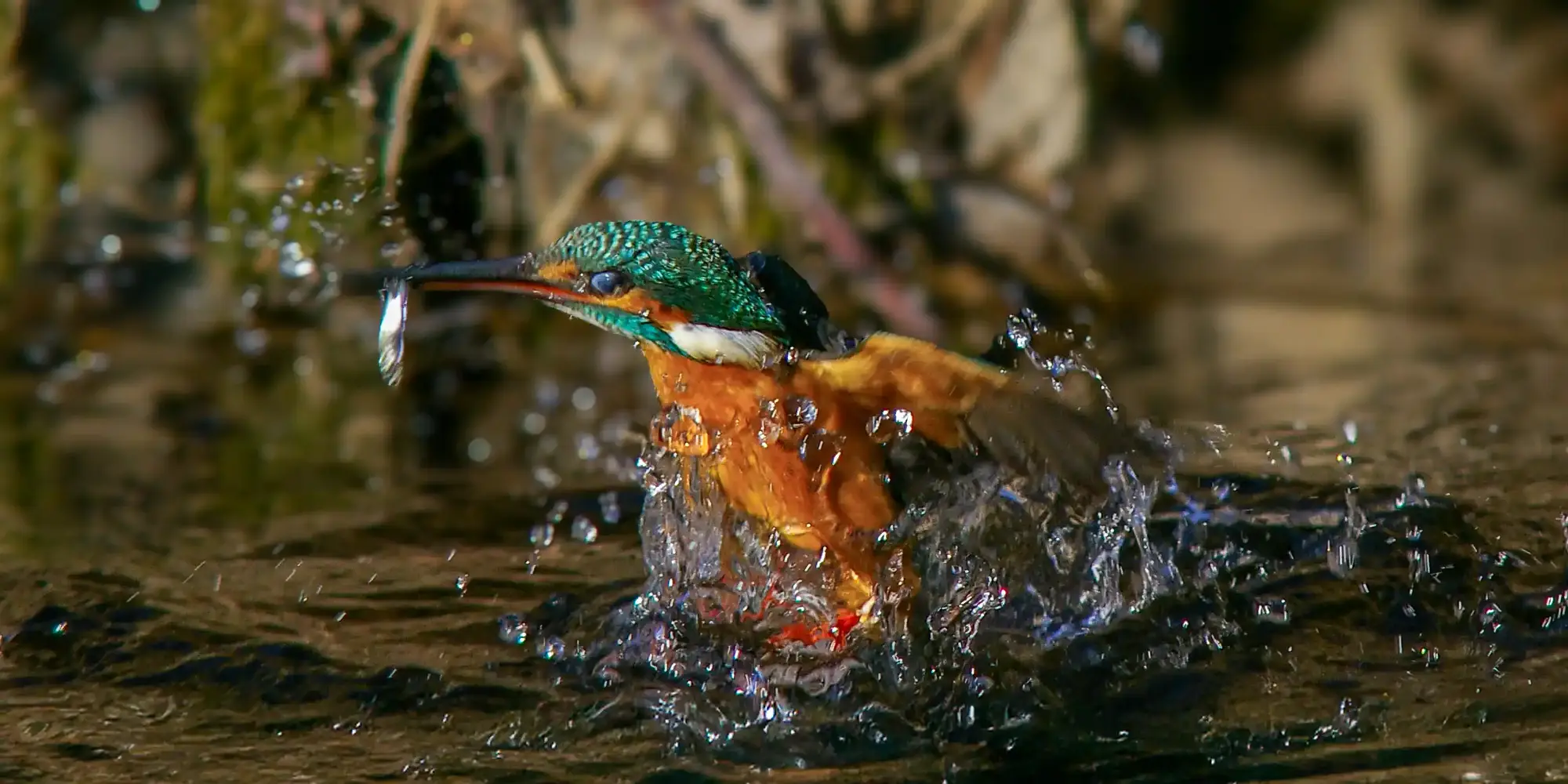 止まり木などにとまったカワセミはそこから水中の魚を見つけ、飛び込んで獲物をとらえます。