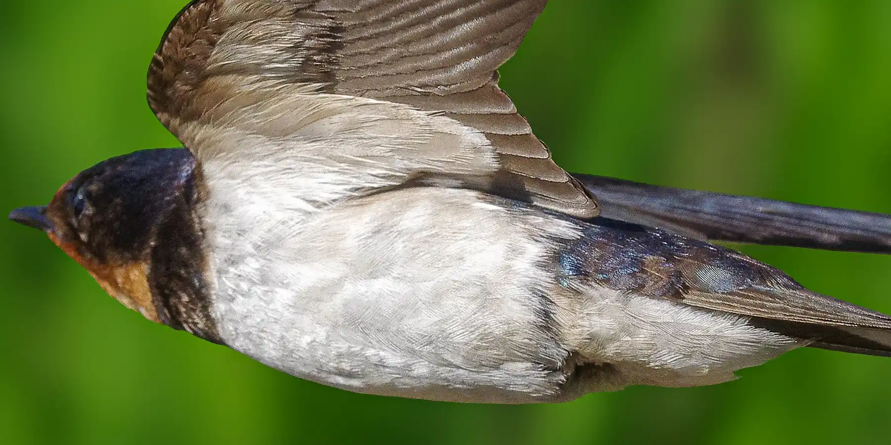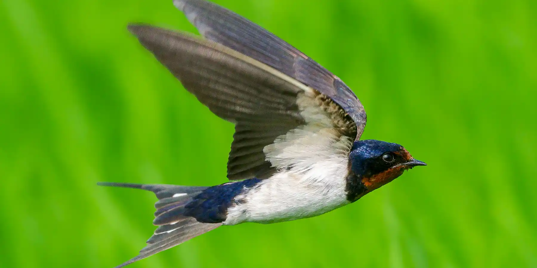 ツバメの背は光沢のある紺色で、喉と額が赤茶。腹は白い。